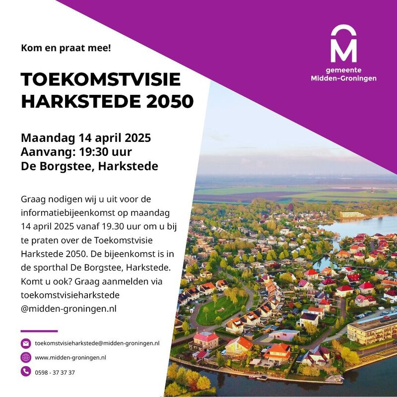 - Op maandag 22 april van 19:30 tot 21:30 was er een startbijeenkomst in de Borgstee in Harkstede. Het verslag vindt u door hier te klikken! De presentatie die we op de avond hebben laten zien bekijkt u door hier te klikken! Heeft u vragen of opmerkingen? Stuur dan een mail naar toekomstvisieharkstede@midden-groningen.nl.